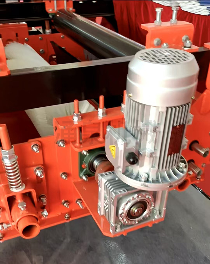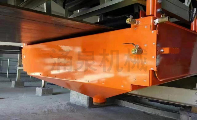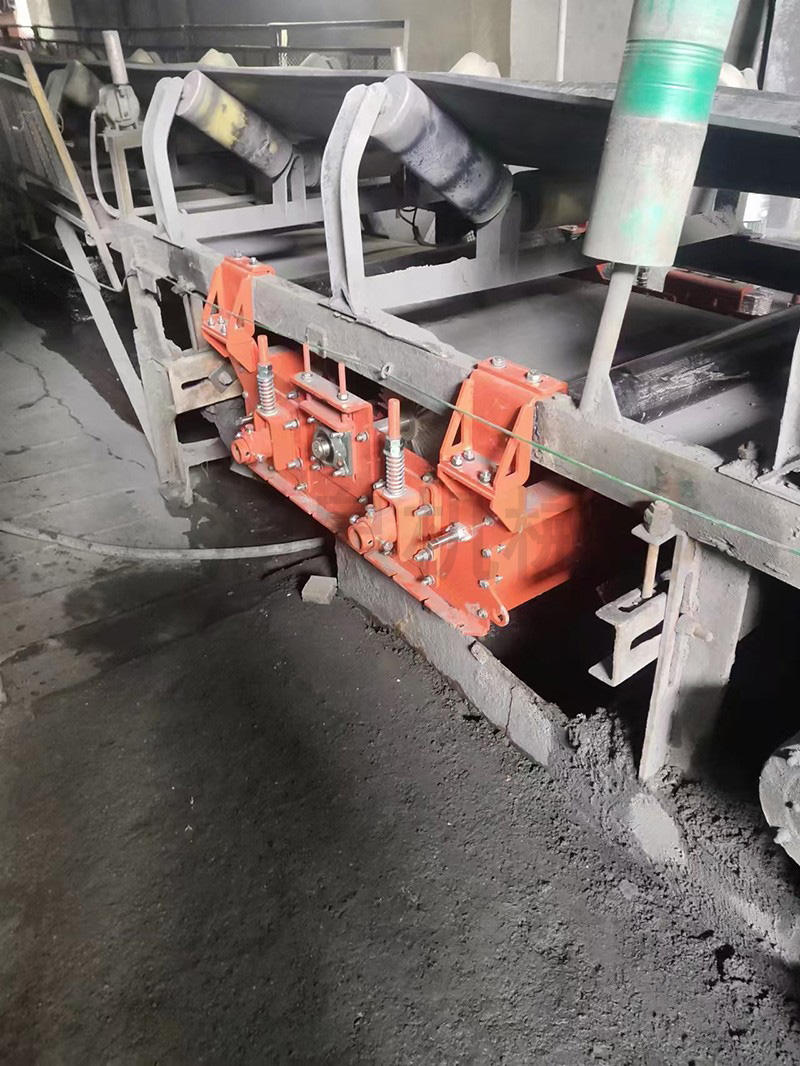 回程輸送帶從水刀進入,噴水管可以對回程輸送帶下表面上的殘留物料進行噴淋,使干燥的物料軟化,第一道清掃器刮刀緊貼回程輸送帶下表面,刮除殘留物料,最后第二道清掃器刮刀則將第一道清掃器遺漏的少許殘渣等刮除干凈,第三道為除水清掃器,刮除回程皮帶下表面的水流,最后經過風刀,將回程皮帶下表面吹干。